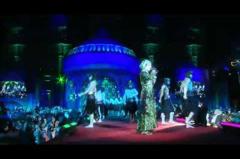 The ‘Trespassing’ chart topper rocked an Ali-Baba style turban and intricately decorated harem pants and shirt, while flanked by lots of shirtless “thieves” — 40 to be exact.