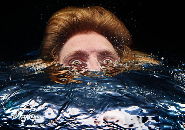 He photographs his subjects as they are either being swallowed into water or rising up out of it. The expressions he’s able to capture through his talent and vision are quite remarkable – veering between unsettling and amusing.