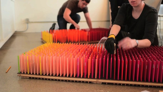 The 14′ x 6′ mosaic consists of 12,000 colored pencils, arranged in patterns that appear to be reaching out towards the viewer. To create the piece, the designers sectioned the installation off into parts, and meticulously organized the colors based off of a detailed plan. The pixelated rainbow uses 25 unique colors, arranged by plugging the tips into a 1x1 grid, which evolve from black on the edges to white near the center of the piece. If you are interested in learning more, you can watch the video below to see how the team put the installation together.