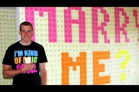 Brett Beutler asked his girlfriend to marry with over 8,000 sticky notes. Take a look at this cute proposal as well as some hilarious news reporting by CNN news anchors. It's a good thing she said yes! This was a proposal that took a great deal of time. Amazing!