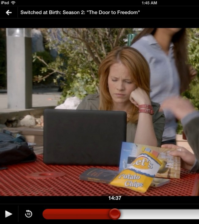 According to Community‘s Wiki, Let’s, an obvious parody of Lay’s, right down to the similar design, have actually appeared in more than a dozen TV series, including Arrested Development, New Girl, Veronica Mars, Gilmore Girls, and The Middle. Lest you think the distinctive bag only appears in good shows, though, there’s also 2 Broke Girls. There’s no accounting for taste…except for Let’s. You can count on them being good for the family!